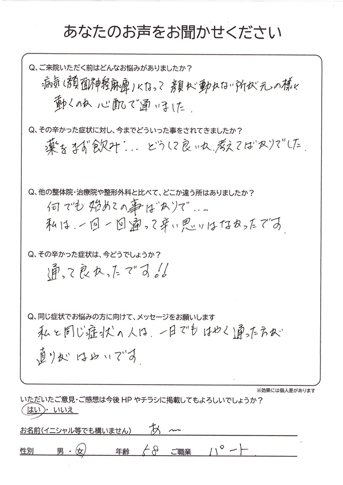 病気(顔面神経麻痺)になって顔が動かない所が元の様に動くのが心配で通いました。