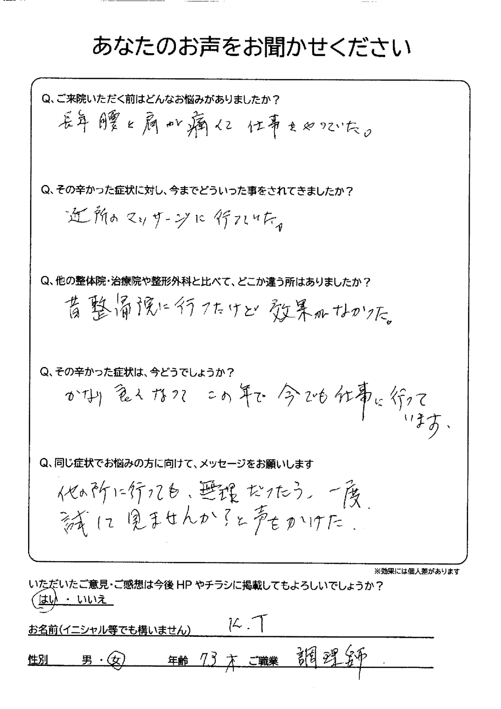 かなり良くなって、この年で今でも仕事に行っています。K.T様 73歳
