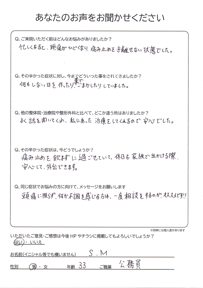 痛み止めを飲まずに過ごせていて、休日も家族で出かける際、安心して外出できます。S,M様 33歳 公務員